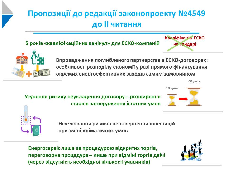 4 жовтня 2016 року Верховна Рада України прийняла за основу законопроект (реєстр. № 4549 від 29.04.2016 р.) про внесення змін до базового закону з енергосервісу - Закону України № 327-VIII від 09.04.2015 «Про запровадження нових інвестиційних можливостей, гарантування прав та законних інтересів суб’єктів підприємницької діяльності для проведення масштабної енергомодернізації».