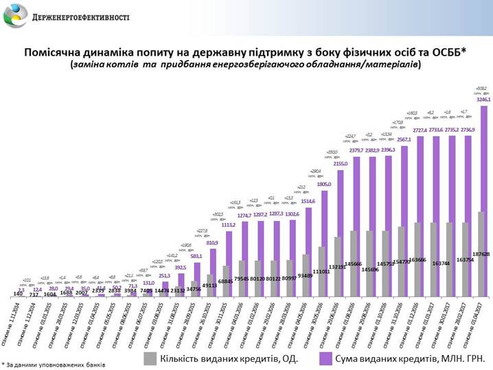 У березні понад 25 тисяч родин стали учасниками Урядової програми "теплих" кредитів та залучили на реалізацію енергоефективних заходів у своїх оселях 509 млн гривень. Це абсолютний рекорд, досягнутий вперше за три роки дії програми. Ця сума коштів у півтора рази та навіть удвічі перевищує показники кращих періодів програми. Наприклад, у листопаді 2015 року за місяць сім'ї отримували разом близько 300 млн гривень.