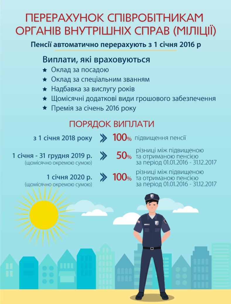 При перерахунку пенсій також враховано вимоги Закону «Про пенсійне забезпечення військовослужбовців та деяких інших категорій осіб» в частині перерахунку пенсій колишнім працівникам МВС відповідно до закону «Про Національну поліцію України». Пенсії їм буде перераховано з 1 січня 2016 року з розстрочкою виплати коштів за попередній період. Тобто з 1 січня 2018 року вони будуть отримувати нові пенсії, а сума за попередній період їм буде виплачуватись починаючи з 1 січня 2019 року.