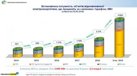 «Крім цього, завдяки цим новим об’єктам загальна потужність відновлюваної електроенергетики зросла у 2 рази лише за 9 місяців: із близько 2300 МВт станом на кінець 2018 р. до близько 5000 МВт станом на 01.10.2019», - прокоментував Голова Держенергоефективності Сергій Савчук.