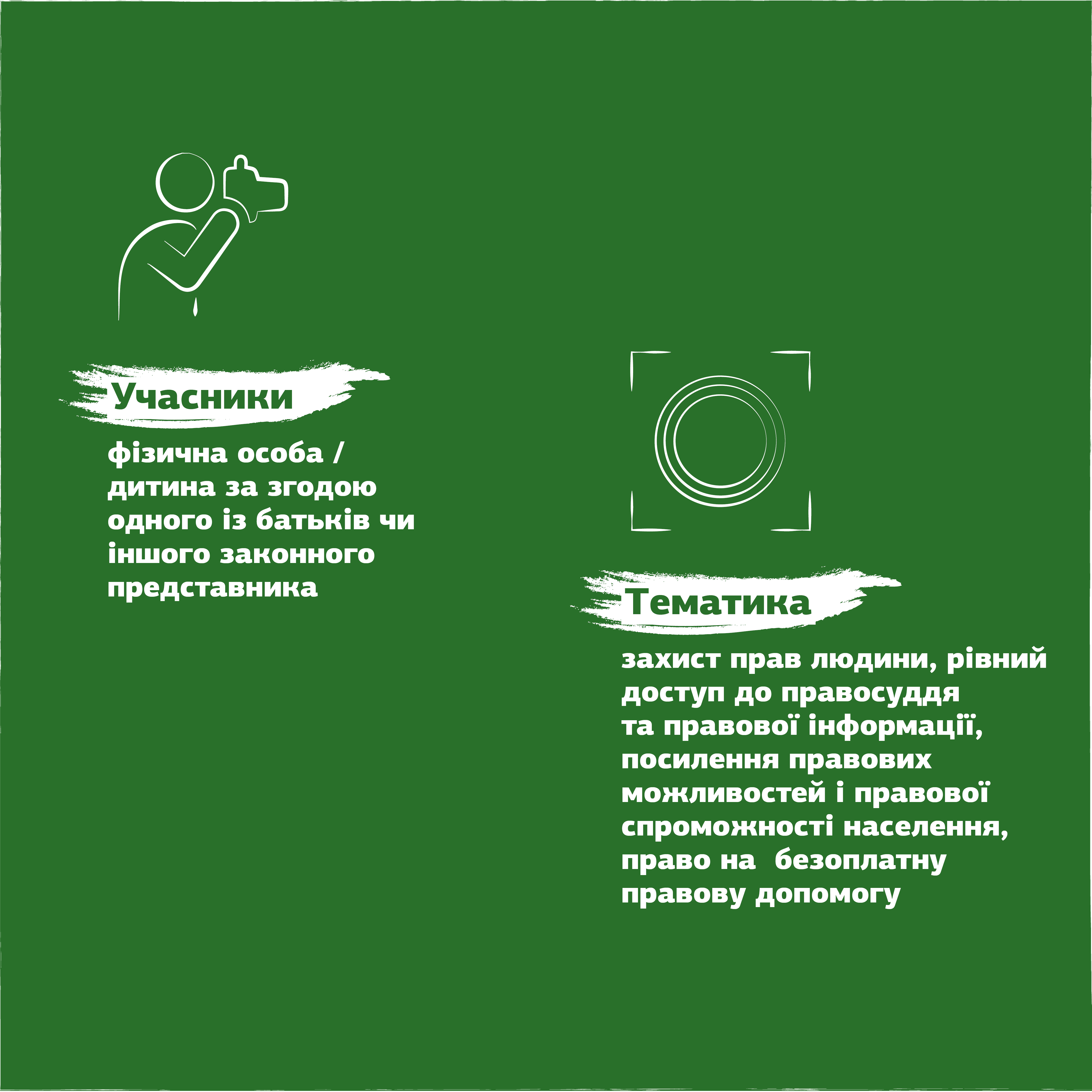 Тема конкурсних робіт (фотографій): захист прав людини, рівний доступ до правосуддя та правової інформації, посилення правових можливостей і правової спроможності населення, право на безоплатну правову допомогу.