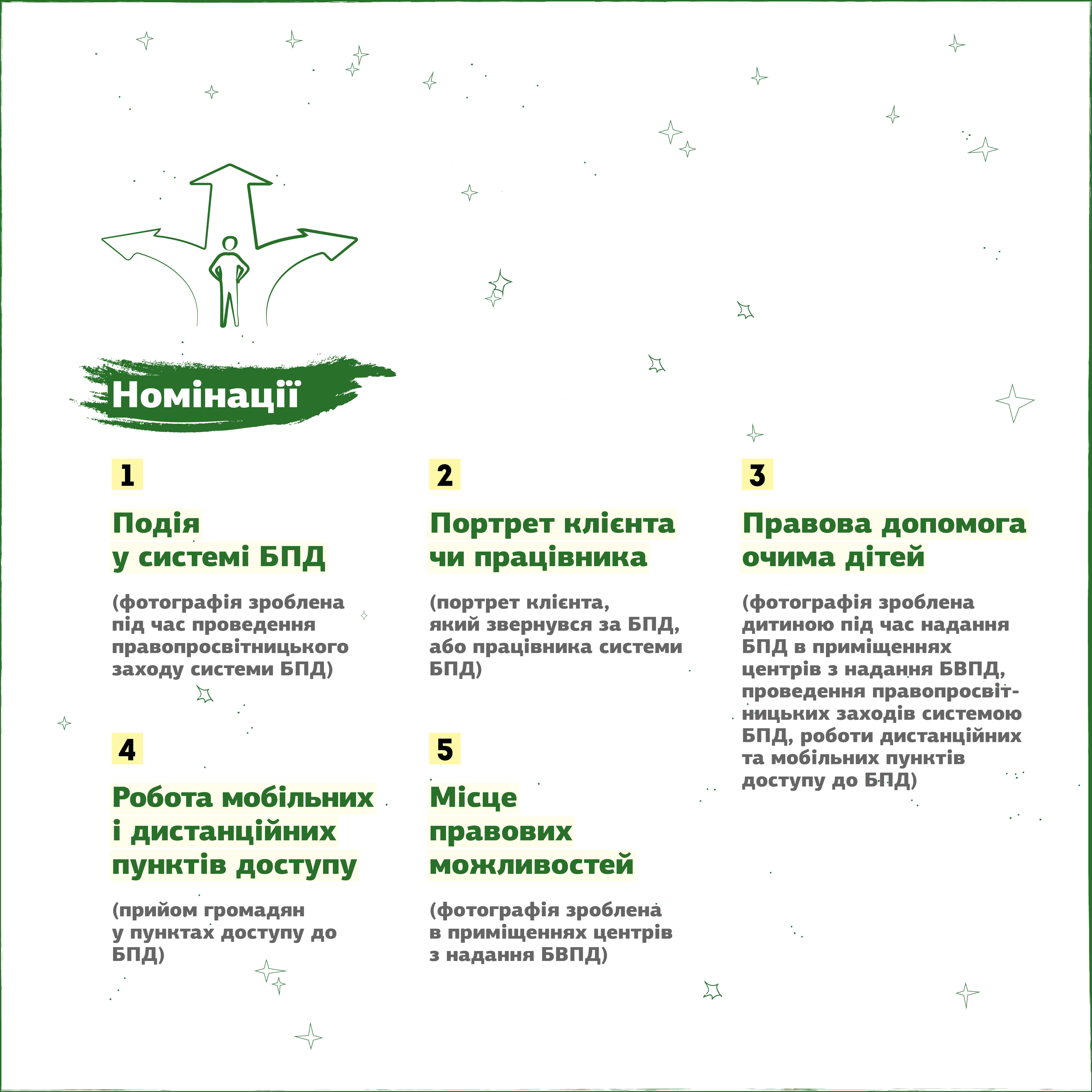 2. Портрет клієнта чи працівника – фотографія людини (клієнта), яка звернулася/зверталася за правовою допомогою до центрів з надання БВПД або фотографія працівника центру з надання БВПД. Фотографія обов’язково має міститисимволіку системи надання безоплатної правової допомоги (далі – система БПД) (на фотографії має бути присутній буклет, банер, значок, вивіска, прапорець, іншадрукована чи сувенірнапродукція з логотипом системи БПД) (обов’язково має бути згодаклієнта або працівника на проведення фотозйомок, публікування та подальше використання конкурсної роботи (фотографії).