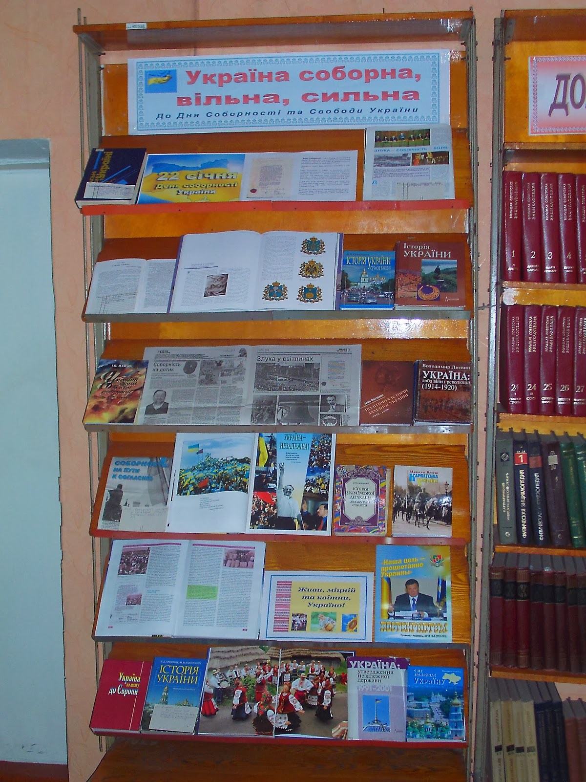 Після огляду книжкової виставки проведено урок патріотизму. Юнацтво разом з бібліотекарями пригадали історію виникнення свята Дня Соборності України , відповідали на запитання вікторини на знання державної символіки та історії виникнення свята Дня Соборності.